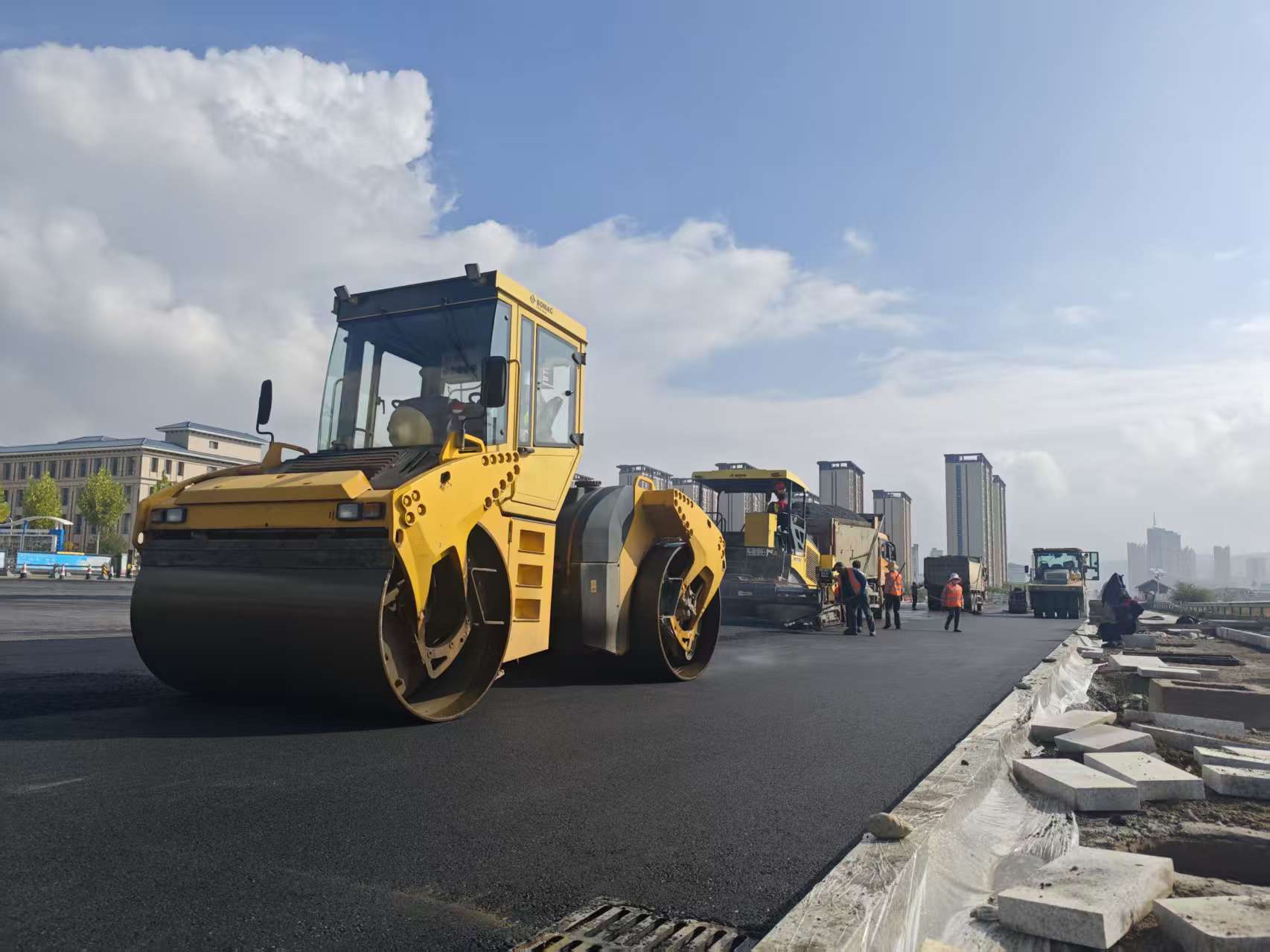 从路基开挖、地下管网铺设,到水稳层施工、沥青混凝土面层摊铺,项目各施工环节紧密衔接、有序推进。值得一提的是,在推进建设进度的同时,项目部始终将群众利益放在首位,积极采取多项举措减少施工对周边居民生活的影响。通过合理调整施工时间,避开居民午休、夜间休息时段开展噪声较大的作业;采用洒水降尘、渣土全覆盖、设置围挡等措施,有效控制施工扬尘污染;此外,项目部还主动与周边社区、居民建立沟通机制,定期通报项目建设进展,及时回应群众关切问题,以贴心服务赢得了沿线群众的广泛理解与支持。正是凭借着这份责任与担当,项目团队在克服诸多困难后,最终实现了在国庆前夕顺利通车的目标。