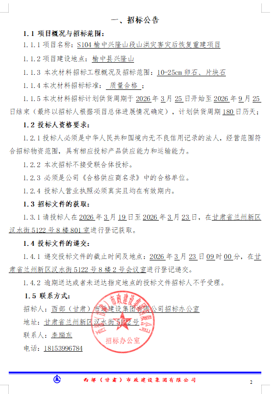 S104榆中兴隆山段山洪灾害灾后恢复重建项目-石材招标公告