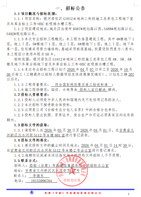 <h3>银河居住区G1812＃地块三标段施工总承包工程地下室及车库自粘土工布+HXC虹吸排水槽工程-专业分包招标公告</h3>